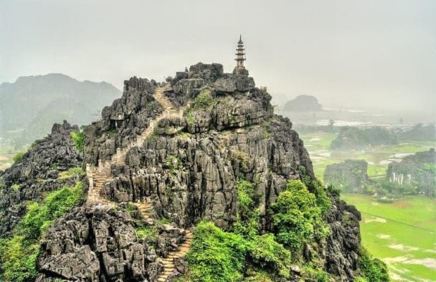 You continue the journey to visit Mua Cave. The cave is located at the foot of Mua mountain. The road to the top of the mountain is modeled after the Great Wall of China with nearly 500 stone steps. From here, you can admire the whole beautiful scene of Tam Coc area – a famous scenic spot in Ninh Binh.  Mua Cave is also invested and built into an eco-tourism destination combined with climbing sports.  The mountain is shaped like a bell, located in the complex of Tam Coc rocky mountains. Along the way, you will pass through many rice fields, villages and wharfs, rivers, lakes and majestic mountains.